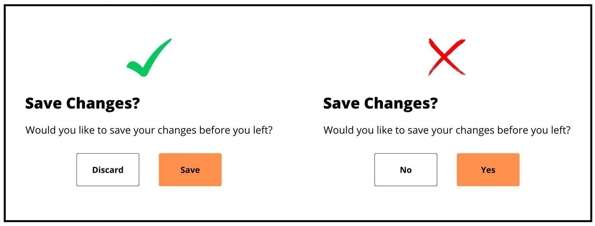 This can be seen in the example below. When the dialog text is blocked and only the button is visible, a button label with an action verb allows the user to take an action, but a button with a "yes/no" label does not. Action verb button labels are more task efficient and prevent user error.