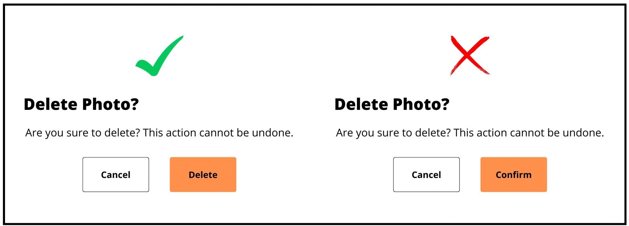 For example, if the user is deleting a photo, a button that says "Delete" tells the user that clicking the "Action" button will delete the photo. This is clear and specific to their mission.