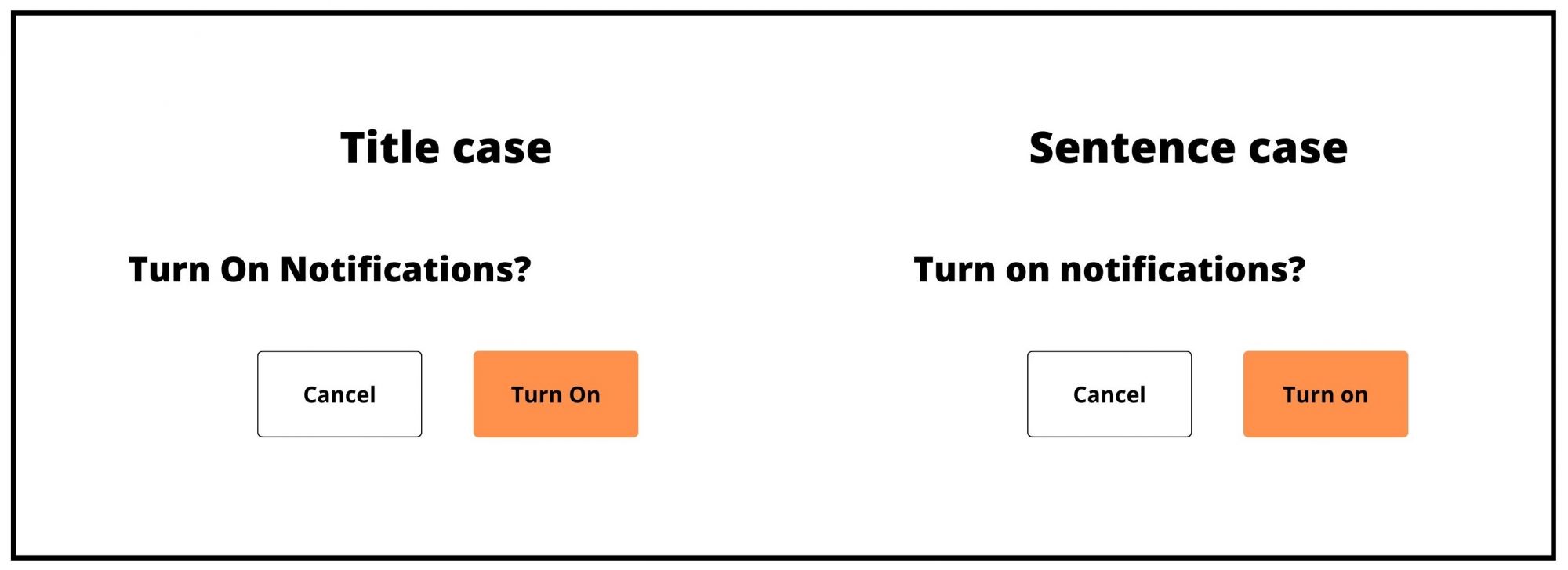 Capitalization is a tool in UX writing to improve comprehension and consistency of text elements and needs to be given due attention. The most popular forms of capitalization are: sentence case (capitalize only the first letter of a sentence and proper nouns), title case (capitalize the first letter of every word except articles, conjunctions, and propositions), and capitalization (capitalize each letter). The appropriate capitalization style depends on your product - you can read more about this here. In general, if you're writing internationally-oriented content, use sentence case, as this is more international-friendly (unless the product is aimed at a US audience). Title case can be used for title/subtitle/label text (<4 words). In most cases (pun intended), it's better to choose one format for consistency.