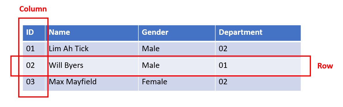 Data is recorded in each row of the table. One line here represents the employee's information. For example, the second line is the employee's information with employee ID 02. His name is Will Byers with gender Male in a department with the ID 01.