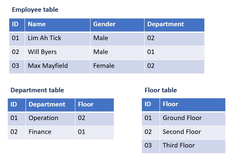 For example, I want to know what is the department record of the employee number "01" in the employee table, I can find the row with the "Department" value of 02 in the department table, and finally find that the employee with 01 is belong to Finance department which correspond with the ID value.