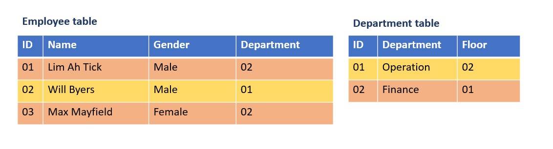 These two tables are related by "Department ID". In order to see the relationship between the two tables more clearly, the same color is used (orange and yellow) to represent the information of the employee.